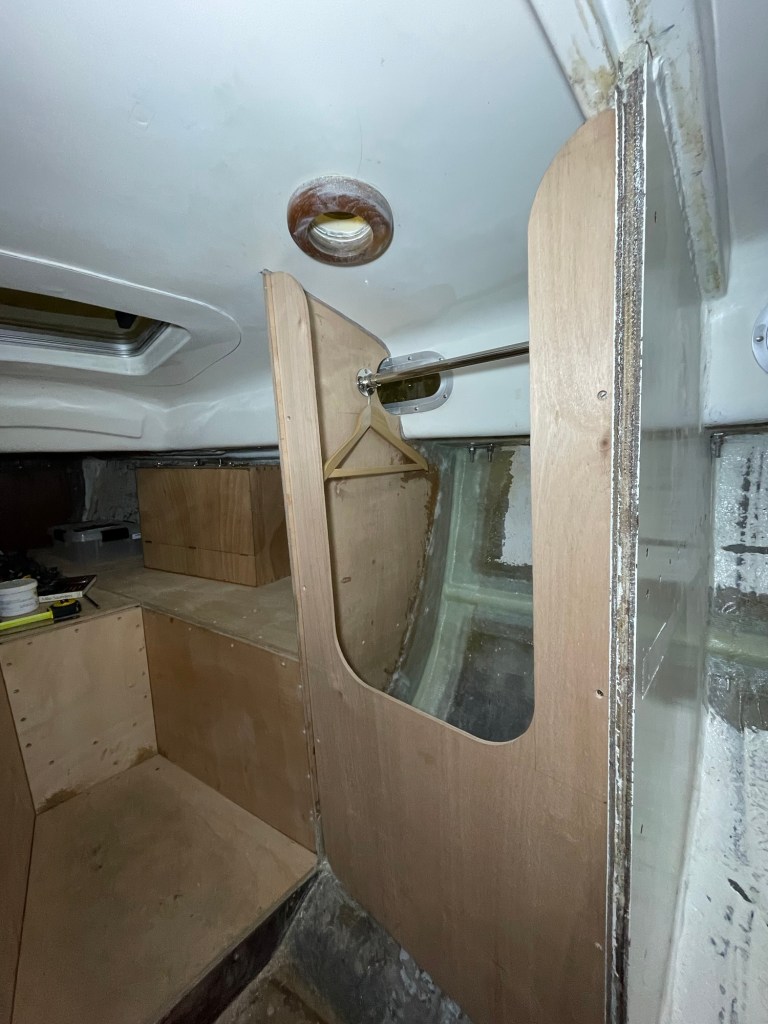 I’m currently working on the ‘engine casing’ – the removable panels that sit in front and above the engine. I’m also fitting some thick ply panels to either side of the companionway which I hope to wedge myself into when it gets rolly!